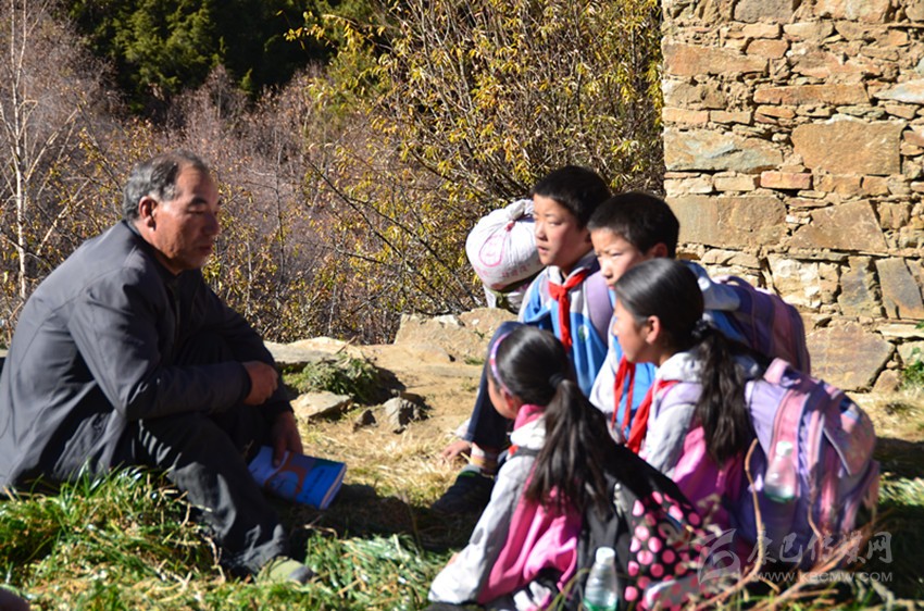 雖然代課教師的工資從當年的每月200元漲到了現在每月800元,然而在以市場經濟為主體的社會里,800元工資的人群屬于低收入群體。盡管如此,阿布里老師依然早出晚歸,在那條他閉上眼都能走的小徑上來回奔波,依舊嘔心瀝血教書育人,那郎朗的讀書聲在藏寨的上空久久回蕩。每天上學放學路上,孩童們在阿布里老師的帶領下,在小徑上排著整齊的隊伍,撒下一路歌聲一路歡笑。