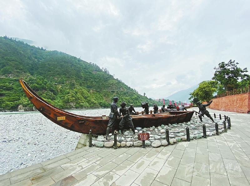 不遠(yuǎn)處的安順場(chǎng)渡口、大渡河邊,矗立著一座“紅軍渡”石碑,上面的三個(gè)鮮紅大字由渡河時(shí)任第一軍團(tuán)第一師一團(tuán)團(tuán)長(zhǎng)楊得志題寫。石碑旁陳列著的一艘長(zhǎng)10.5米、寬2.3米、高2.2米的“紅軍船”,正是當(dāng)年紅軍強(qiáng)渡大渡河時(shí)使用的翹首木船復(fù)制品。木船旁,是戰(zhàn)士和當(dāng)?shù)卮兿蚰敬\(yùn)送武器裝備的雕像,斜坡上,勇士隊(duì)伍正奔向渡口。