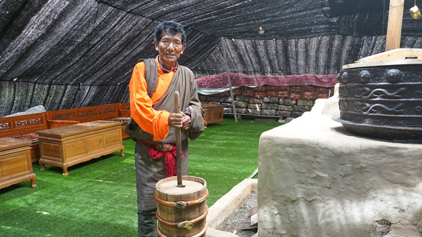村民在布置牦牛毛黑帳篷。
