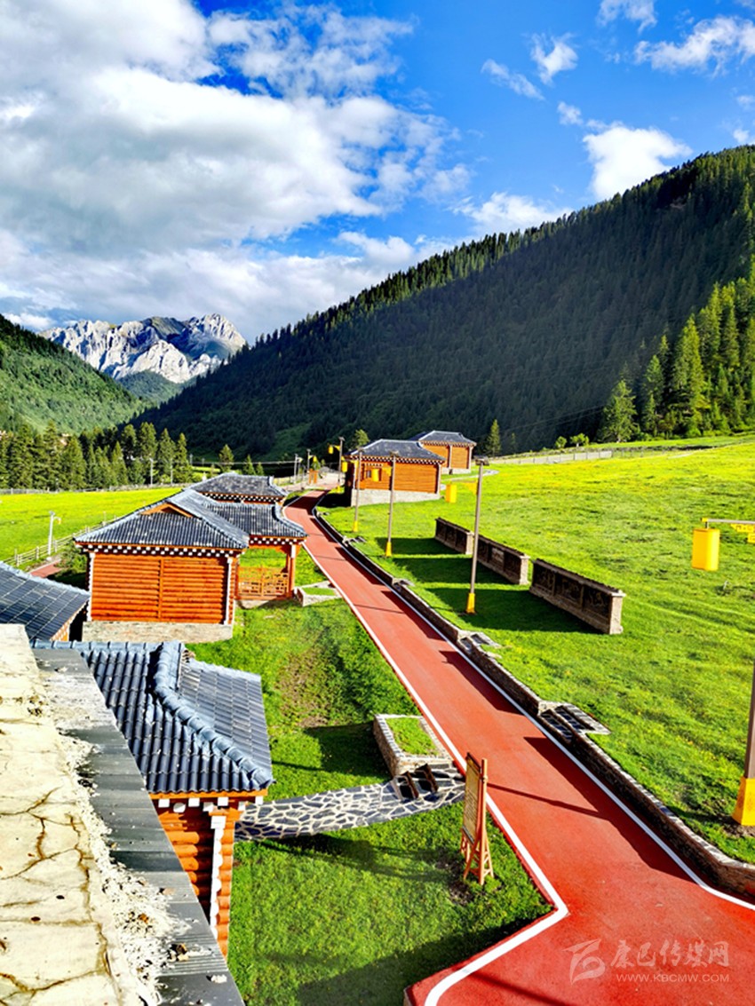 記者在翁丹的指引下,登上崩科式三樓一底的游客服務(wù)中心露臺(tái),幾張大茶幾、燒烤桌擺放其中;貼著露臺(tái)矮墻,是視野開(kāi)闊之處,17棟改造完畢的傳統(tǒng)特色樹(shù)皮游牧房沿著丘陵,經(jīng)半山草場(chǎng),錯(cuò)落有致地向山頂分布。崩科木屋全新落成,藏式家具備齊,雪山溫泉入屋,小徑四通八達(dá),咖啡廳、棋牌室、茶坊、餐廳……皆以籌備妥當(dāng),一切只待開(kāi)園。