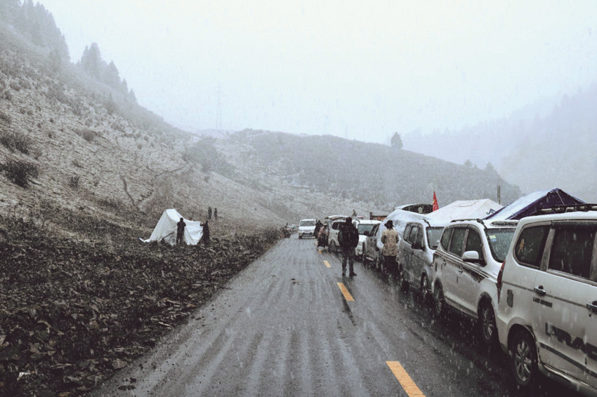 然而,高原的天、娃娃的臉,說變就變。剛剛還艷陽(yáng)高照的晴好天氣,瞬間寒風(fēng)四起,鵝毛大雪不一會(huì)便覆蓋了整個(gè)山野。由于到達(dá)蟲草采集點(diǎn)還需4、50分鐘人力轉(zhuǎn)運(yùn)物資,受天氣影響,前行受阻,擔(dān)任護(hù)送任務(wù)的民輔警當(dāng)即幫助群眾搭建臨時(shí)安置點(diǎn),風(fēng)雪中警民互助的身影像極了一家人。一切收拾停當(dāng),盡管風(fēng)寒雪大,條件艱辛,樂觀的群眾和伴隨服務(wù)的民輔警還不忘在風(fēng)雪中來一張合照,他們說,這是歷年來的慣例,每次上山采集蟲草和下山返程,他們都會(huì)一個(gè)不少地拍張“全家?!保源肆裟钕x草季警民相依的美好記憶。