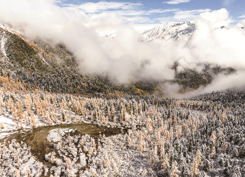 雪山、藍(lán)天白云和黨嶺村的彩林構(gòu)成一幅優(yōu)美的畫卷。新華社 發(fā)