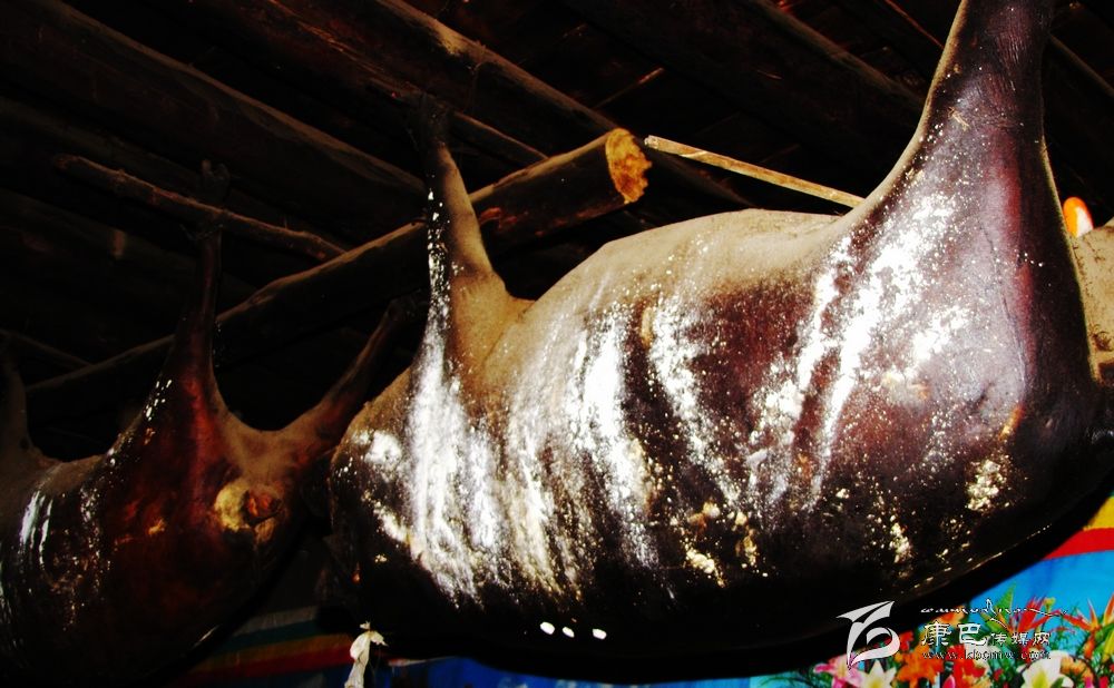 臭豬肉用扎壩語準(zhǔn)確翻譯應(yīng)譯“陳豬肉”或“舊豬肉”。由于其惡味乍聞重于“臭豆腐”,濃于廣東的“酶香咸魚”,所以稱“臭豬肉”。但扎壩人卻視之為上品,極其愛吃,并作為居家待客的最高珍品,家家戶戶都要熏制存放,且越存放得久越被視為珍貴,因此,在扎壩地區(qū),家中懸掛多少“臭豬肉 ”和懸掛的年限多少也自然成為當(dāng)?shù)睾饬控毟坏南笳鳌?br />