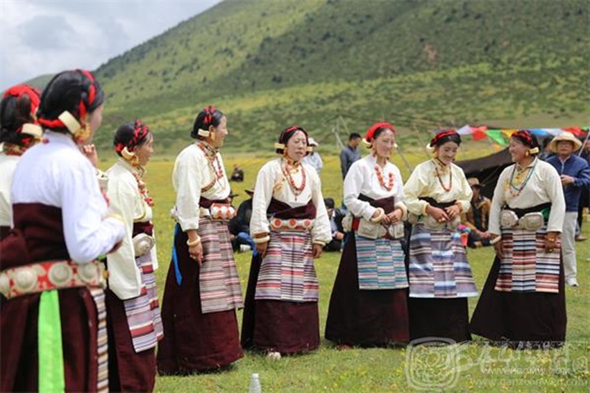 主要分布在道孚、雅江、康定縣折多山以西農(nóng)區(qū),九龍縣農(nóng)區(qū),瀘定嵐安鄉(xiāng)一帶又各自有特點。木雅地區(qū)服飾,婦女頂戴袋狀帽,將帽檐一側(cè)內(nèi)疊扣于頭上,上沿額伸出頭額前,寬至兩鬢,長約30厘米的袋狀帽箭垂于腦后,然后用大紅頭繩或五彩頭繩編發(fā)辮纏盤于帽上,端莊嫵媚。男著柔軟的潔凈光面羊皮袍,或在皮袍面上鑲吉祥符,卷草花圖案,質(zhì)樸、粗礦而美觀,頭戴狐皮帽。
